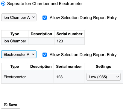 If devices with calibration factors for the machine the schedule is associated with, then the device may be selected from a list of devices with calibration factors. Here is an example using a separate ion chamber and electrometer: