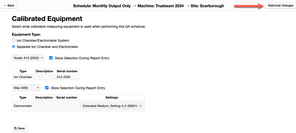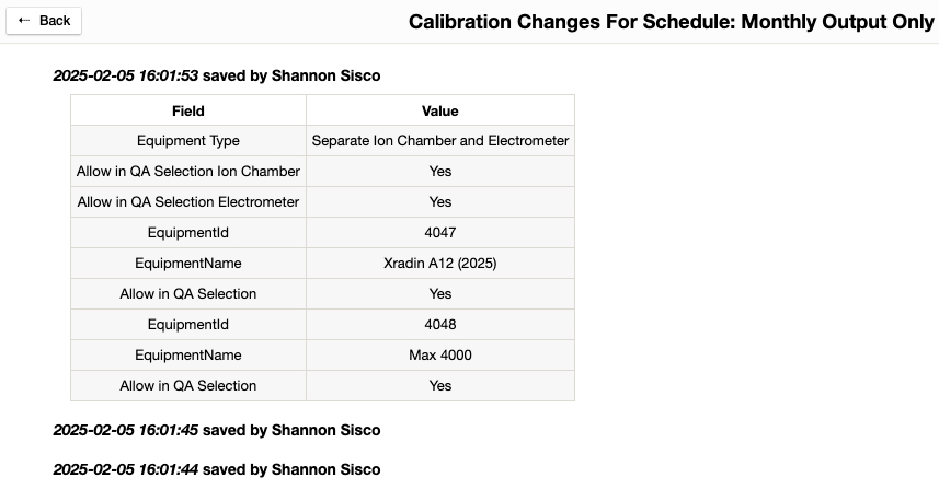 A list of historical changes to the calibrated equipment on the schedule will appear.