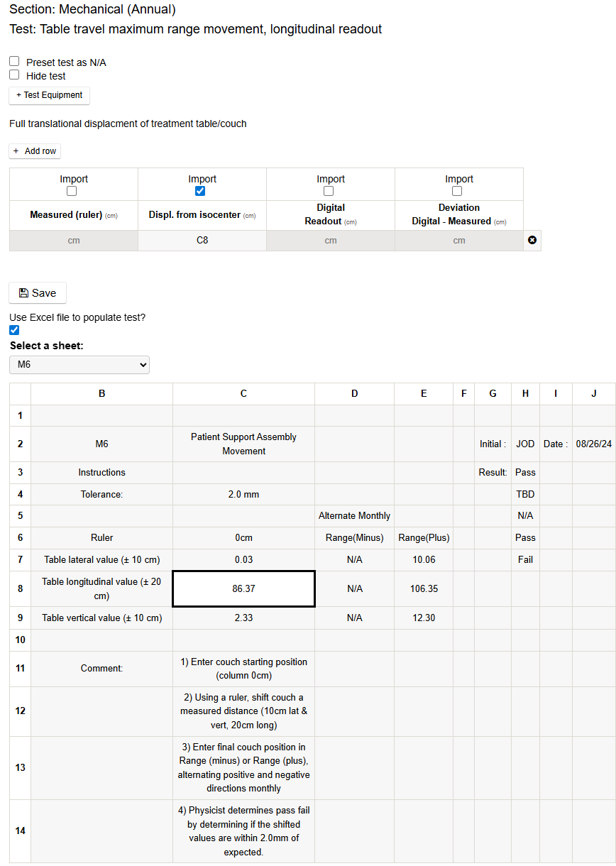 For each test that will import data from the spreadsheet, scroll down to the QA Test Settings section and find the desired test. Click the Edit Test Settings button and a page similar to the one below will be displayed: