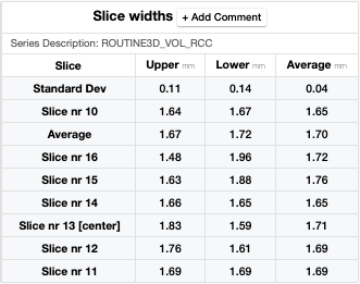 As described in the Tomophan manual on page 15, the slice sensitivity profile (SSP) is calculated for the slices in which signals from the full bead ramp can be seen. To evaluate slice width, measure the Full Width at Half Maximum (FWHM) of the fitted SSP. Start by determining the half-maximum of the fitted SSP. Subtract the background value (minimum value of fitted SSP) from the maximum value of the fitted SSP and add half of that difference to the background value. In some cases, the background value may already be accounted for. Each peak in the SSP represents a bead in the ramp, so count the number of beads with a maximum intensity over the half-maximum value. Multiply the number of beads by 0.25mm, which is the z-axis spacing, to calculate slice width. Note that as slice thickness increases, the maximum value for the beads decreases due to volume averaging. Presuming the slice thicknesses are accurate, the peak signal over the background in a 1mm slice should be double that of the peak signal over the background in a 2mm slice. This rule, due to the effects of tomographic reconstruction, only loosely applies.