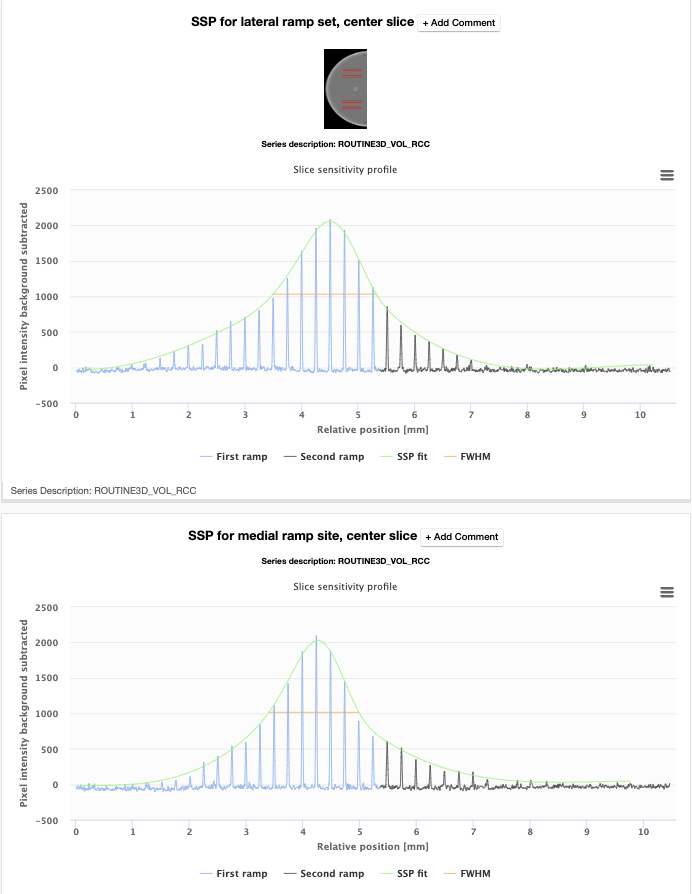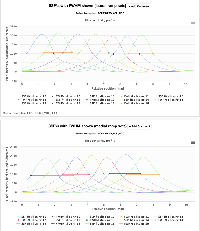 Figure 6.2 (right): Slice sensitivity profiles with their corresponding Full Width at Half Maximums (used to calculate slice width) for upper (lateral) and lower (medial) ramp sets.