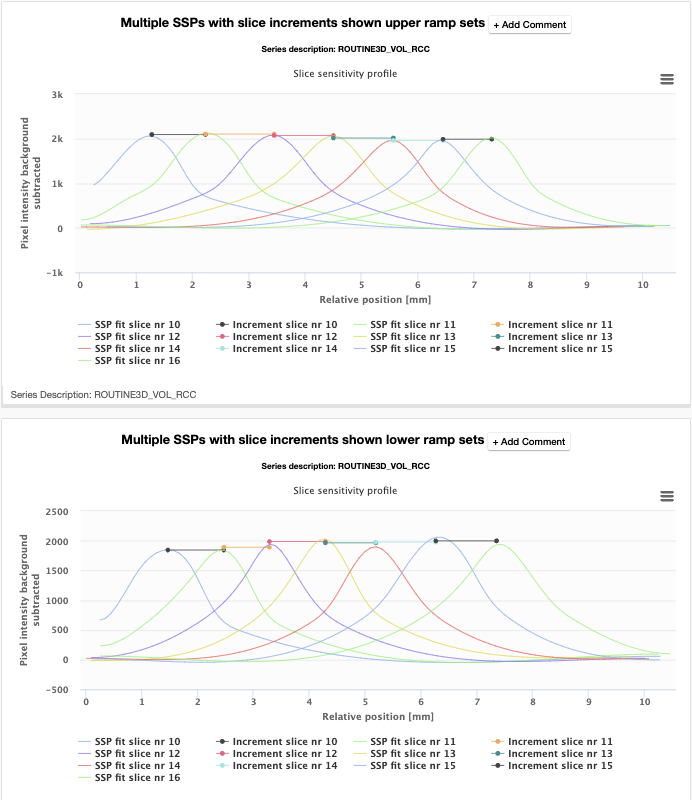 The slice sensitivity profiles are used to accurately calculate the slice widths, slice increments, and remaining signal using the upper (red) and lower (blue) bead ramp sets.