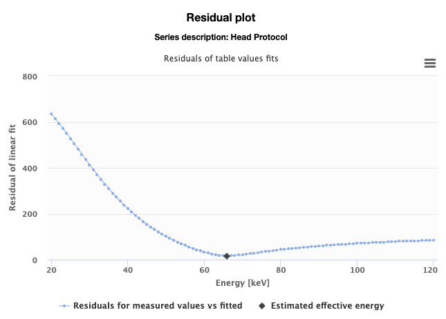 The residuals are calculated from linearity plots for each tabular energy value. The residuals are the distances of the measured values from the line in the linearity plot. From this residual plot the estimated effective energy is derived as the minimum point on the plot.