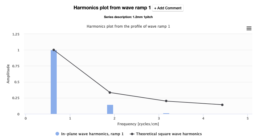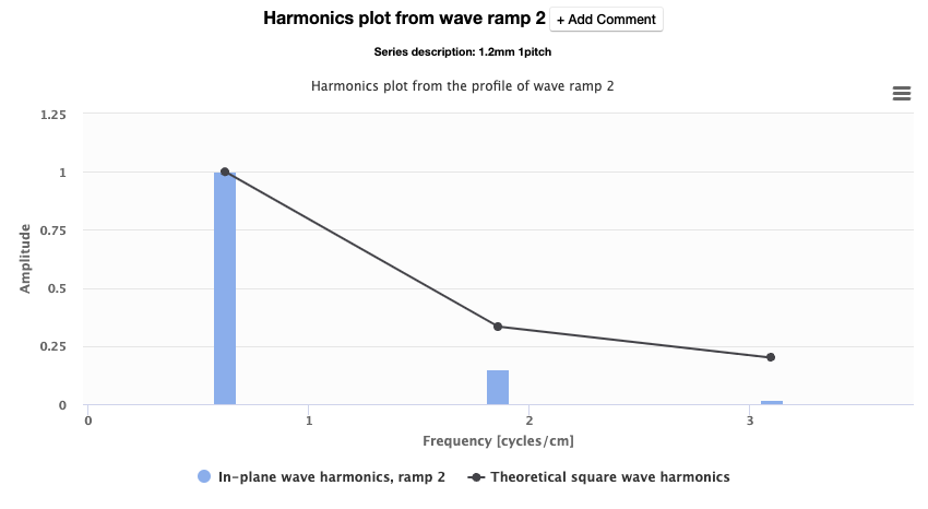 This graph plots the measured harmonics and the theoretical ideal square wave harmonics. With thinner slices and better in-plane resolution, the measured values get closer to the ideal square wave. Below you will see a harmonics plot of the profile of wave ramps 1 and 2 from a scan with 1.25mm slice thickness.