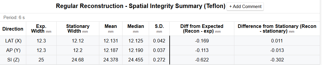 - Measured Width (Teflon Stationary): The measured dimensions of the Catphan Teflon plug in the stationary image set in mm.