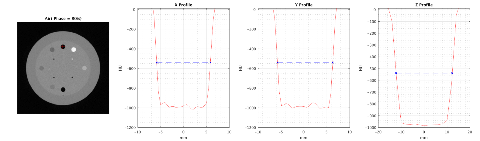 - Threshold: The mean HU of the sensitometry measurements of the air void and LDPE plug. This threshold value is where the widths of the x, y, and z profiles of the air void are determined.