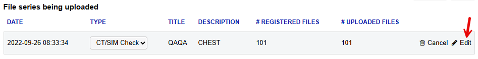 Once file series have been uploaded they will be displayed below the upload control. To remove a series from the queue click the Cancel button beside the series. To start processing click the Start Processing button. A description for the image series can be added at this point. Click the Edit button next to the series. Type a description for the series into the text box that appears below Description and either click Save or press the enter key. The description can also be edited after the images have been processed. Descriptions will appear in the report with the analysis of the series.