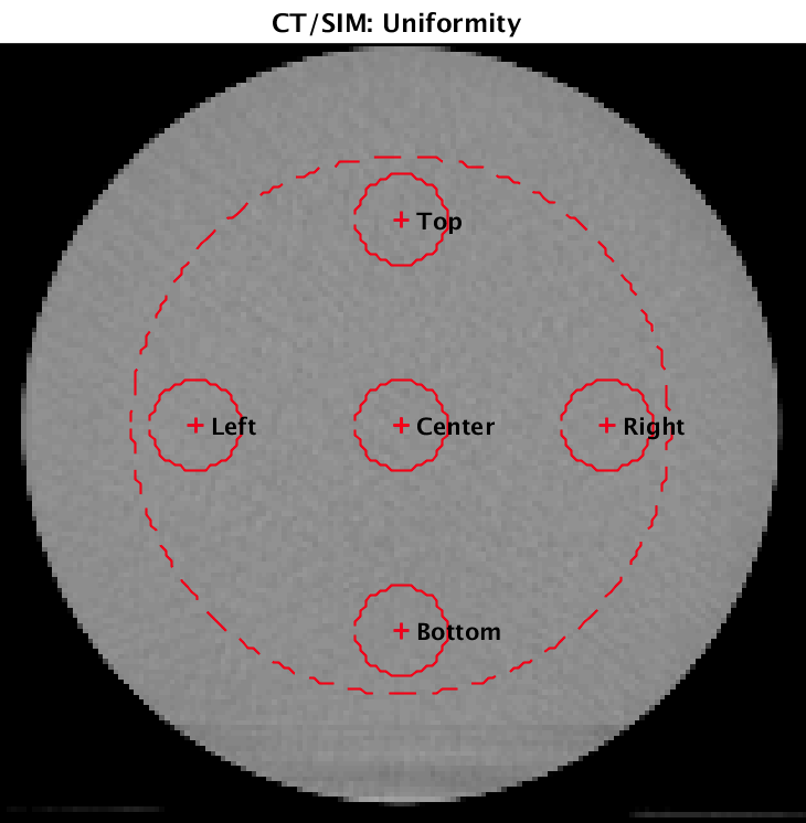 Mean pixel values and standard deviations are reported for the center, top, right, bottom, and left ROIs as shown in the figure below. The center of each ROI is marked with the plus sign.