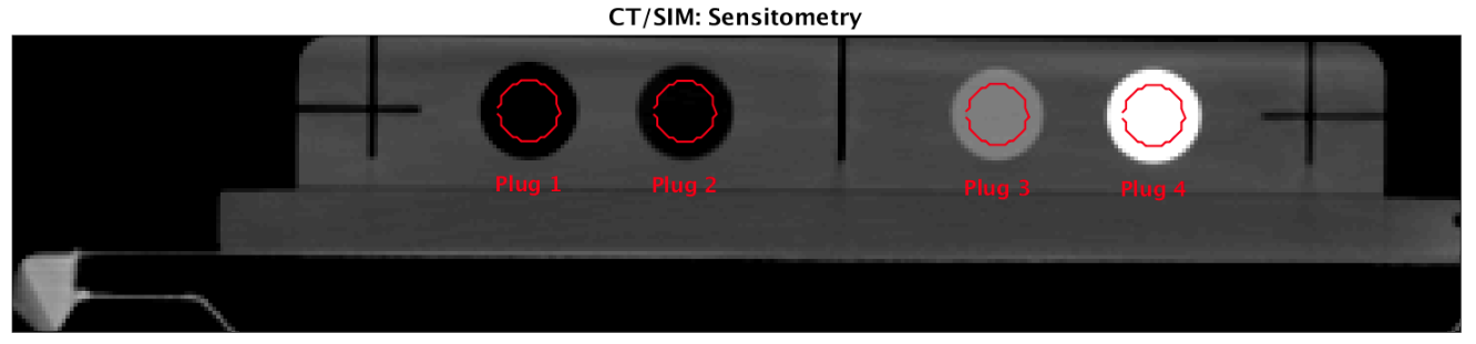 The analysis will repot on the mean HU value for the area inside the marked region of interest (ROI). When setting tolerances, please note that the sensitometry plugs are removable and may change positions. Ideally they should be kept in the same position so that any trends may be tracked.