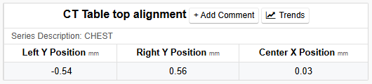 The table top alignment is reported. If the horizontal alignment is even then the Left Y Position (left red plus sign) and Right Y Position (right red plus sign) would be the same. -Y indicates the above center while + Y indicates below center. The center of the image (via DICOM tag information) is where two red dashed lines intersect.